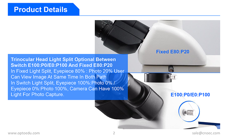 Seidentopf Trinocular Head Inclined 30°,Rotatable 360°, Interpupilary Distance 48-76mm, Light Split Switch E100:P0/E20:P80, Eyepiece Tube Dia.30mm | ○ | ● | A53.2623-T | |